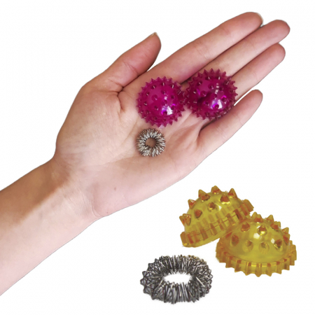 Массажер Ежик представляет собой шарик с небольшими пластмассовыми шипами умеренной остроты, внутри которого находится пружинка, которая эффективно помогает массировать пальцы и межпальцевые промежутки.